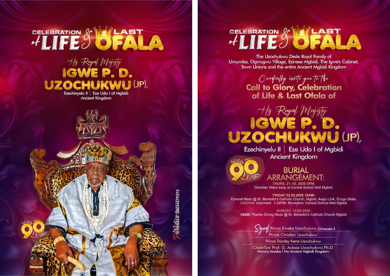 The Uzochukwu Dede Royal Family of Umumba Ogwugwu Village, Ezinese Mgbidi, in conjunction with the Igwe’s Cabinet, the good people of Mgbidi Town, and the entire Ancient Mgbidi Kingdom, cordially invites the general public to the Call to Glory, Celebration of Life, and Last Ofala of His Royal Majesty,