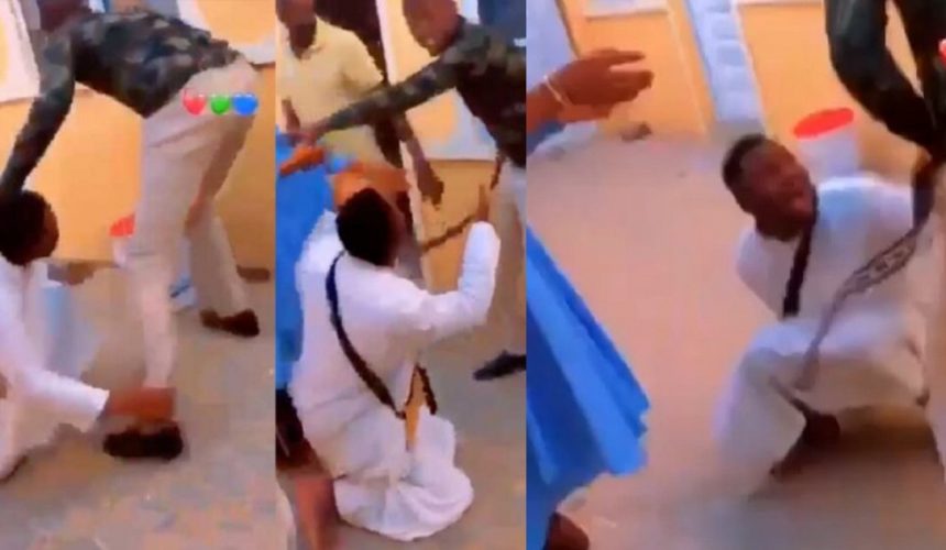 The young man who was subjected to severe beatings by the military man was seen on his knees begging, but his pleas fell on deaf ears as the angry attacker continued to whip him even more.